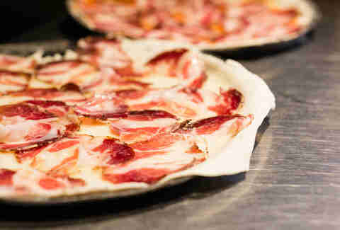 With its flavorful stripes of pork fat that just melt at the slightest heat, thin-sliced prosciutto is the expert’s grilled pizza topping. Its chief virtue is the speed at which it cooks — but on top of that, its lightness allows you to give your pizza a nice layer of meaty flavor without weighing it down.